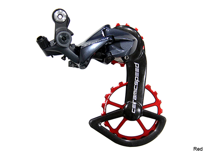The OSPW System for SRAM features two oversized 17-tooth aluminium pulley wheels, available in red, black or limited edition colours.