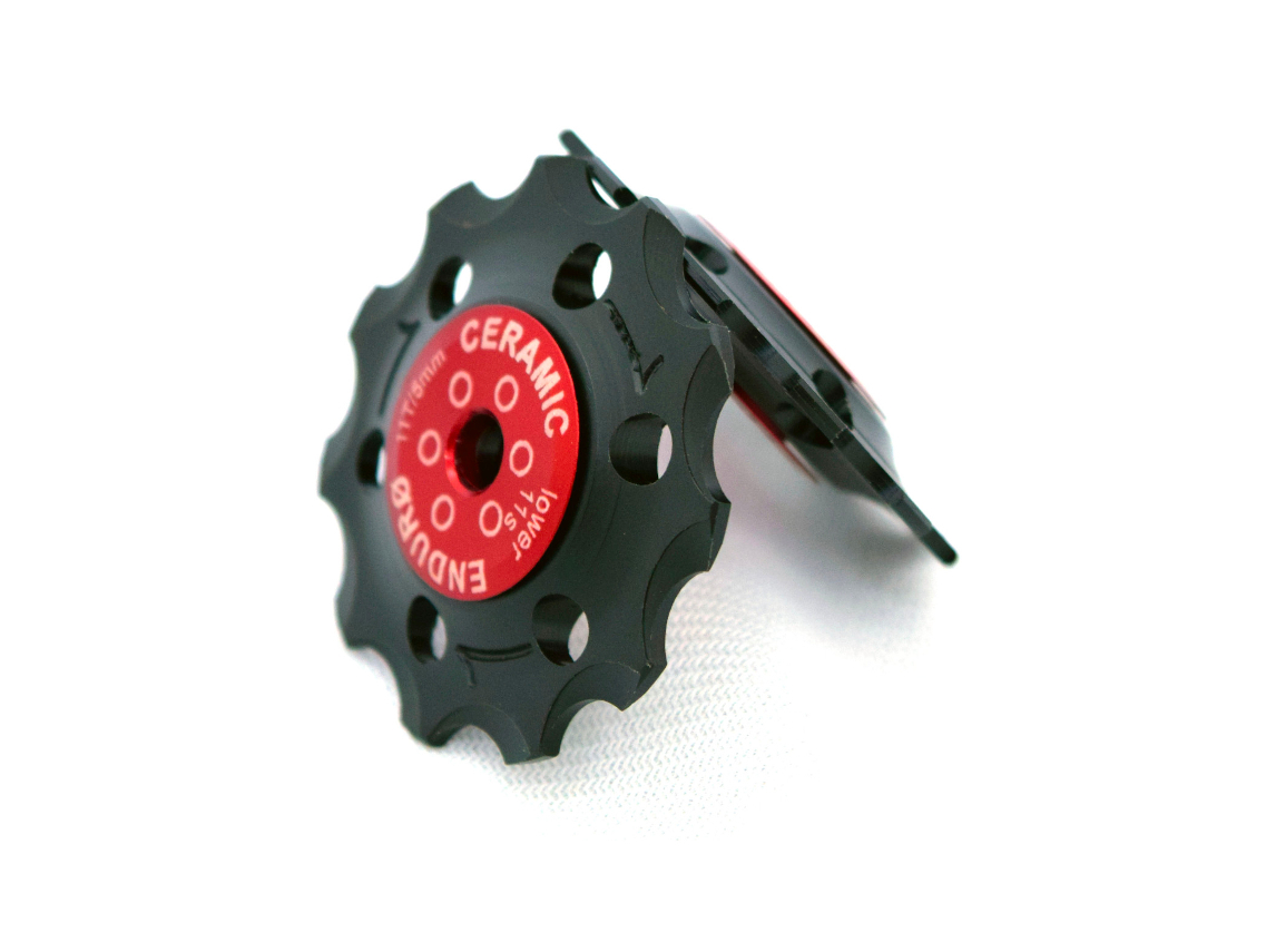 Machined from solid Delrin at their California machine shop, not molded, they are much harder and precise than any competitor’s that have copied this design. Where aluminum jockey wheels are loud and deteriorate almost immediately after installing, Enduro Bearings jockey wheels will shift perfectly and precisely a year or two from now just the same as the day you installed them.
