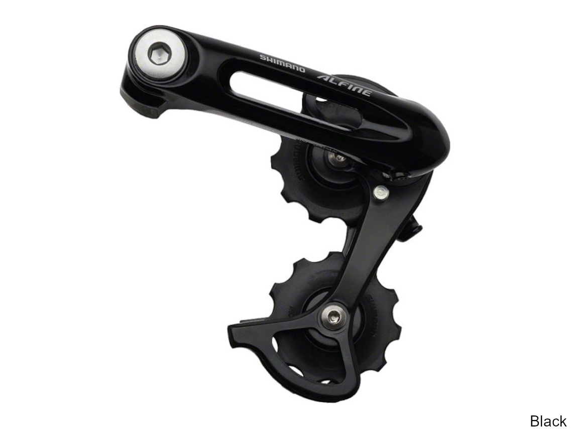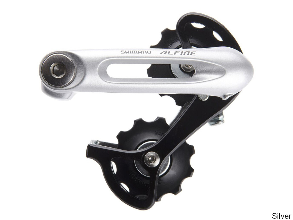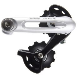 Chain tensioner with a double pulley structure for installing Shimano Alfine speed hubs on frames with vertical dropouts.
