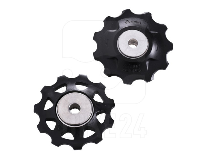 Shimano Tension and Guide Pulley Set for XTR 10-speed. Set consists of guide pulley (with ceramic bearing) and tension pulley (with sealed bearing). With 11 teeth.