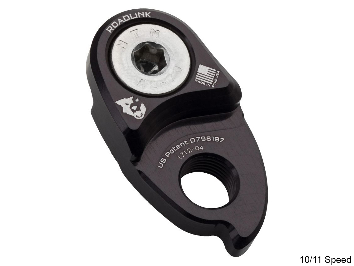 The RoadLink derailleur hanger extension is a unique patented device that offsets the position of your road derailleur to make it possible to run a wide-range mountain bike style cassette.