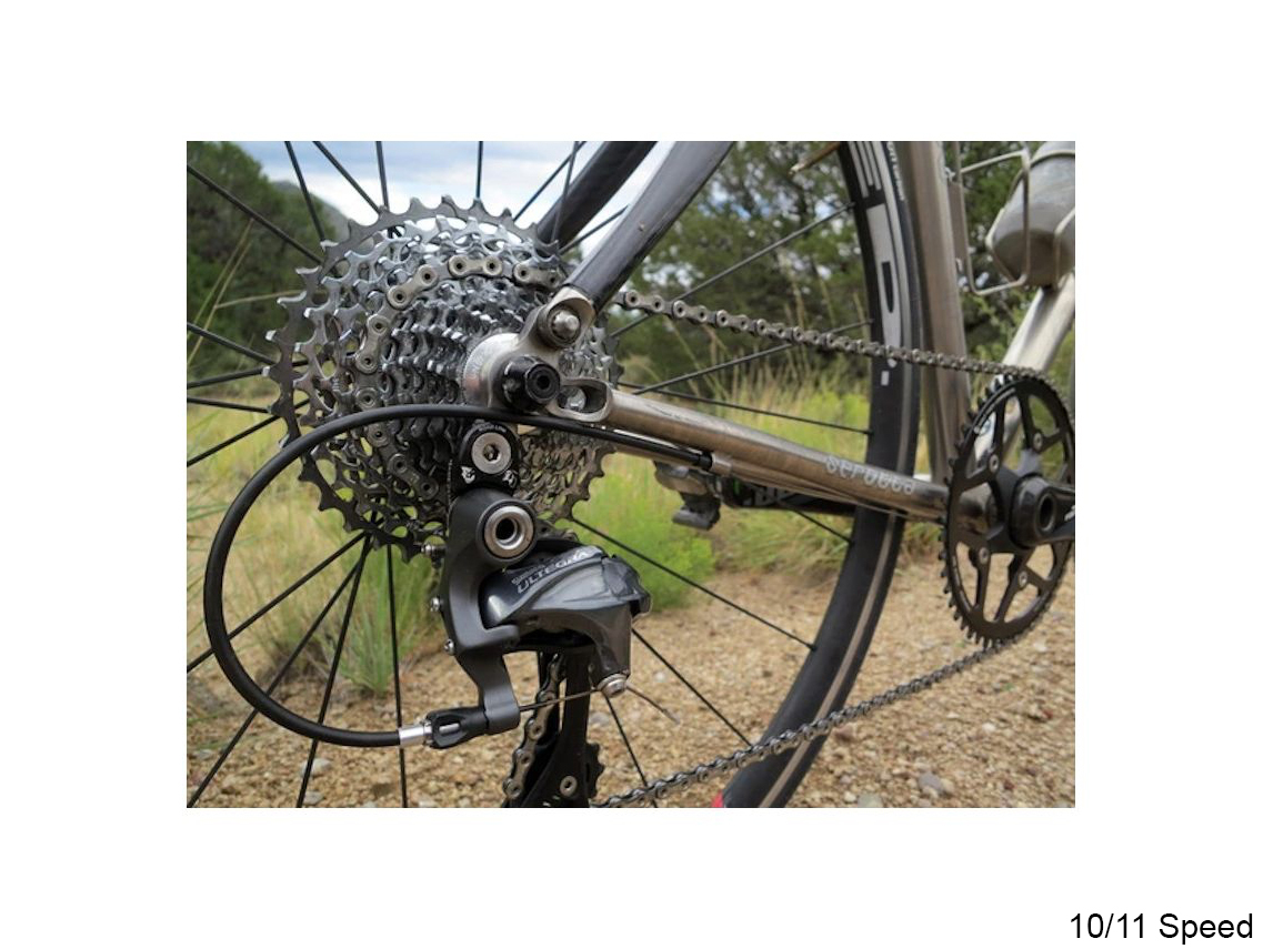 | 10/ 11 Speed | 11-32: Not Required (GS Cage RD works) 11-34: Single (for double chainring be sure to not exceed the derailleur’s capacity) 11-36: Single (for double chainring be sure to not exceed the derailleur’s capacity) 11-40: Single (for double chainring be sure to not exceed the derailleur’s capacity) 11-42: Not supported | 11-32: Not Required (GS medium cage rear derailleur works) 11-34: Single (for double chainring be sure to not exceed the derailleur’s capacity) 11-36: Single (for double chainring be sure to not exceed the derailleur’s capacity) 11-40: Single (for double chainring be sure to not exceed the derailleur’s capacity) 11-42: Not supported 10-42: Not supported | The RoadLink is optimized for the 10- and 11-speed Shimano road derailleur geometry. It also works very well with 9-speed road derailleurs. Traditional SRAM derailleurs. Campy derailleurs work best with cassettes up to 11-36. | Triple chainrings are not supported (medium cage rear derailleurs cannot accommodate that much range). 1x specific SRAM X-HORIZON rear derailleurs. |